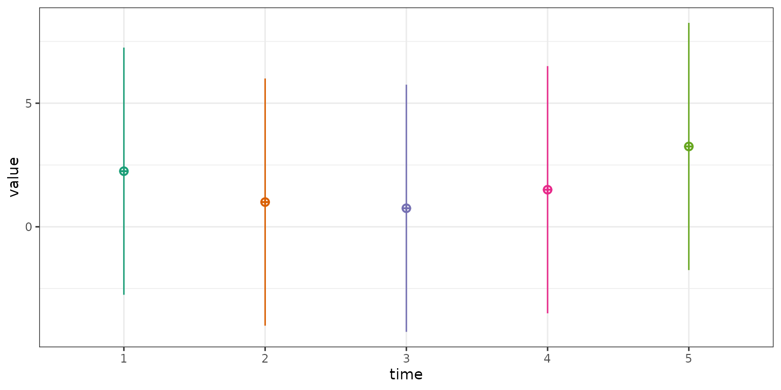 Polynomial coding is the default for ordered factors in R. We’ll set up a new data simulation with five ordered times.