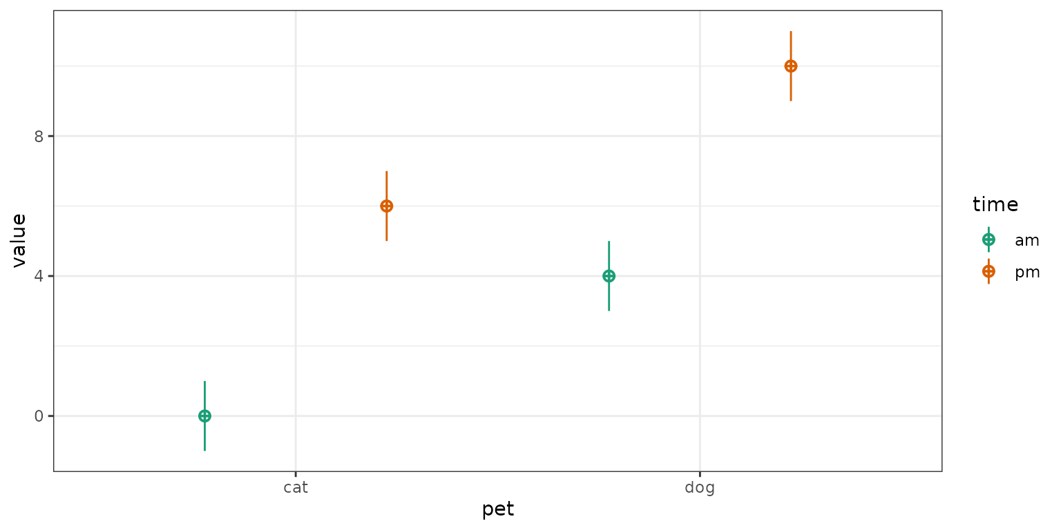 | pet.cat-intercept:time.am-intercept | cat minus mean when am, minus cat minus mean when pm, divided by 2 | ||