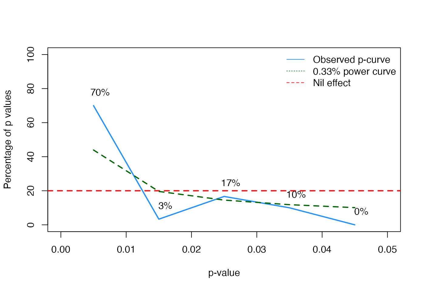 legend("topright", lty=c("solid", "dotted", "dashed"), col=c("dodgerblue", "darkgreen", "red"), legend=c("Observed p-curve", paste0(round(power,2), "% power curve"), "Nil effect"), bty="n")